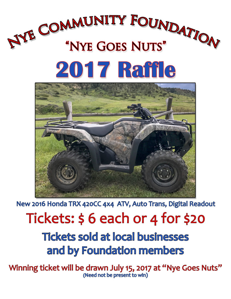 We also offer food and drink for a minimal charge and our annual ATV raffle. This ATV raffle is the only fundraising event we hold. The Nye Community Foundation will again raffle off a Honda ATV Rancher. Raffle Tickets will be $6 each or 4 for $20. Look for tickets available from board members and area businesses!