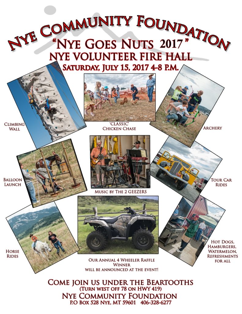 Nye Goes Nuts, the annual fun-in-the-sun community-wide event and fundraiser, will be held on July 15, 2017 from 4pm to 8pm at the Volunteer Fire Department in Nye, Montana. This event is free to attend and offers many fun and family-friendly activities. Some of these include: the chicken chase, a climbing wall, archery, water balloon launch, a petting zoo, face painting, a bouncy castle, horse-drawn wagon rides, and an original Yellowstone/Glacier National Park touring bus which offers rides through the Nye area.